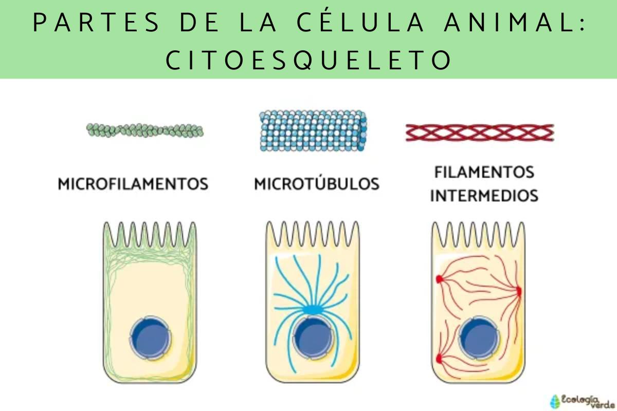 Para terminar de la lista de las principales partes de las células animales, mencionamos el citoesqueleto. Está formado por un conjunto de filamentos que se encuentran en el citoplasma y tiene una función de soporte para los orgánulos, además de la función de dar forma a la célula.