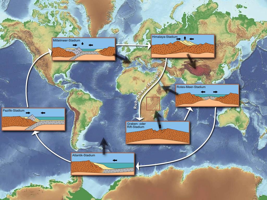 Las placas tectónicas se desplazan unas con respecto a otras según la distribución e intensidad del calor y edad de las rocas implicadas. La interacción entre ellas puede formar estructuras compresivas o extensivas, como los orógenos o dorsales respectivamente. Durante toda la historia de la Tierra se ha podido identificar una periodicidad entre 440-500 Ma. Así, se suceden una serie de eventos que producen la fracturación, desplazamiento y posterior reunificación del supercontinente original. A continuación, se detallan las etapas del ciclo de Wilson.