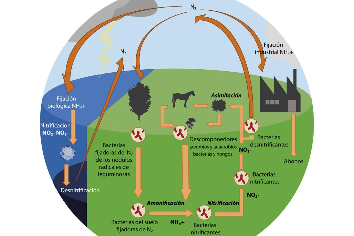 - Presenta una gran dependencia de microorganismos puesto que muchas etapas del ciclo del nitrógeno están condicionadas por la actividad de microorganismos específicos, como bacterias nitrificantes y desnitrificantes, que desempeñan un papel fundamental en la conversión de diferentes formas de nitrógeno.