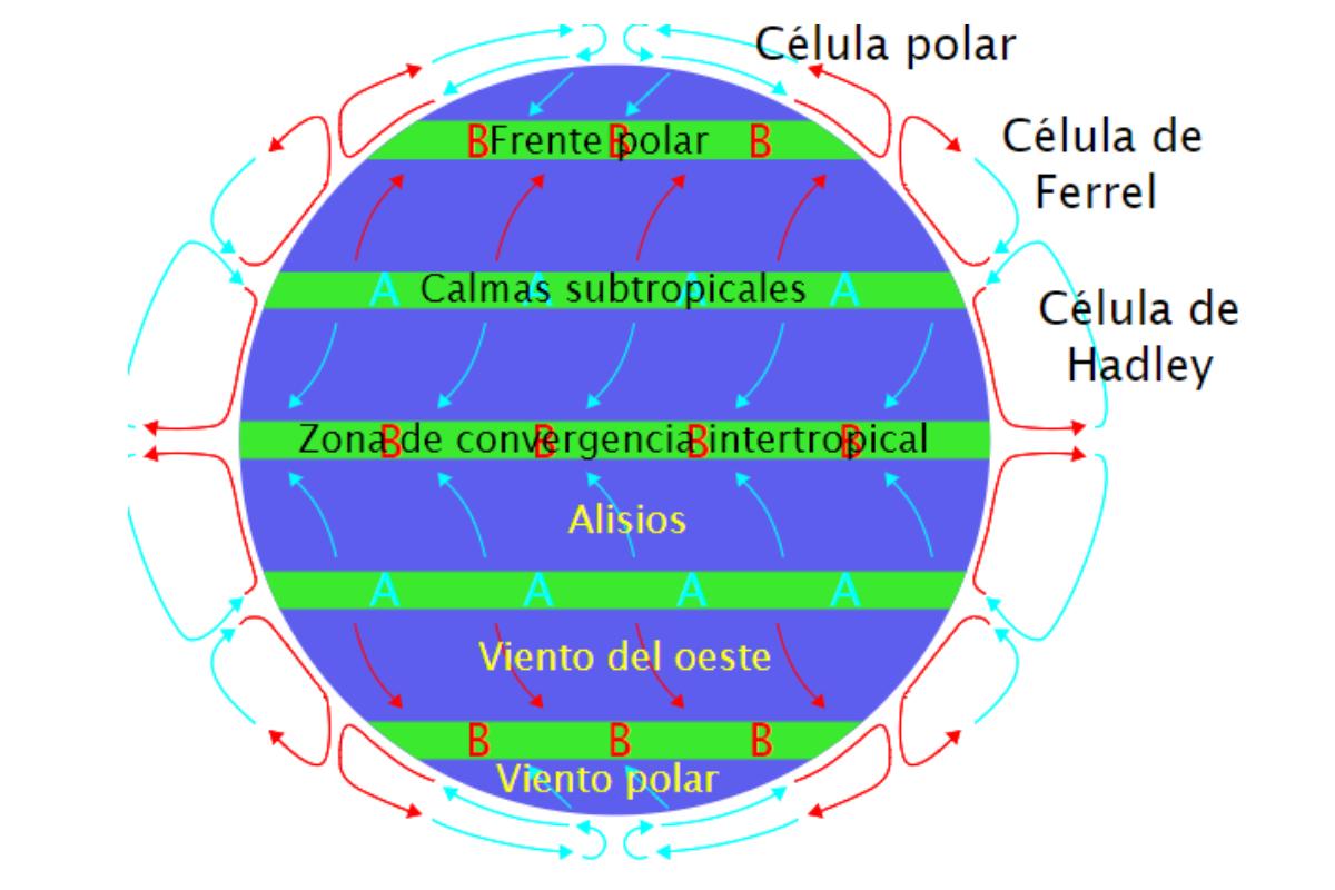 La circulación general atmosférica es el movimiento a gran escala del aire en la atmósfera terrestre, impulsado principalmente por la energía solar. Este movimiento se produce debido a las diferencias de temperatura y presión entre distintas regiones del planeta, lo que genera patrones de vientos que permiten el transporte de calor desde las zonas más cálidas (cerca del ecuador) hacia las zonas más frías (cerca de los polos). El sistema de circulación general está compuesto por una serie de células que se repiten en cada hemisferio. Estas son las células Hadley, Ferrel y Polar.