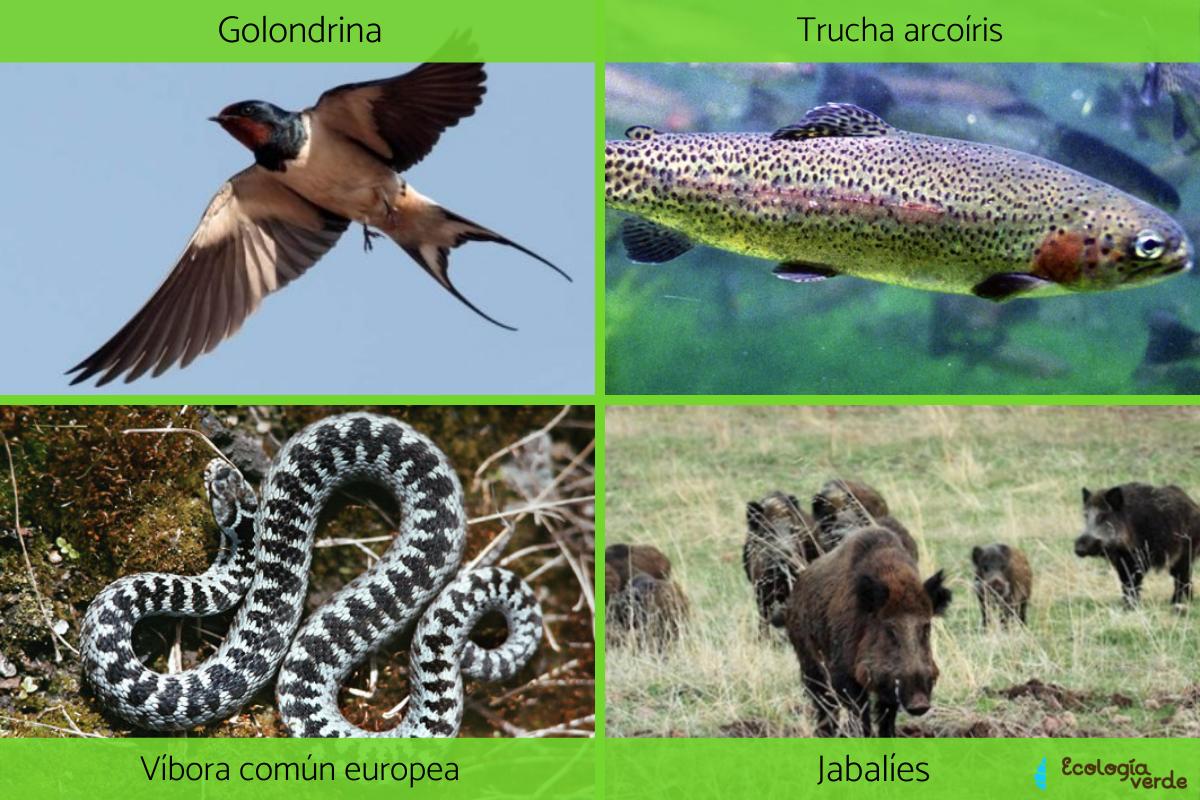 - Aves: gaviotas, tórtolas, ánades reales, golondrina, lavanderas, ostreros, cernícalos, alionines, verderones, colibríes o paros carboneros.