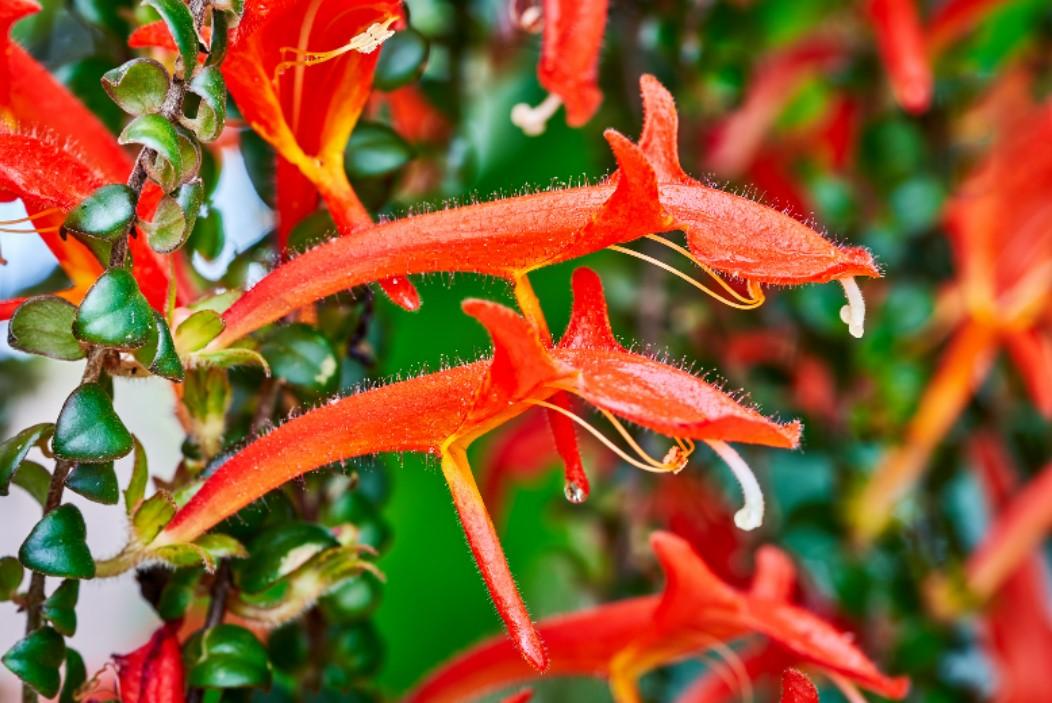 - Las flores suelen surgir en otoño de las axilas en sus hojas, siendo los colibríes sus principales polinizadores en su entorno natural.