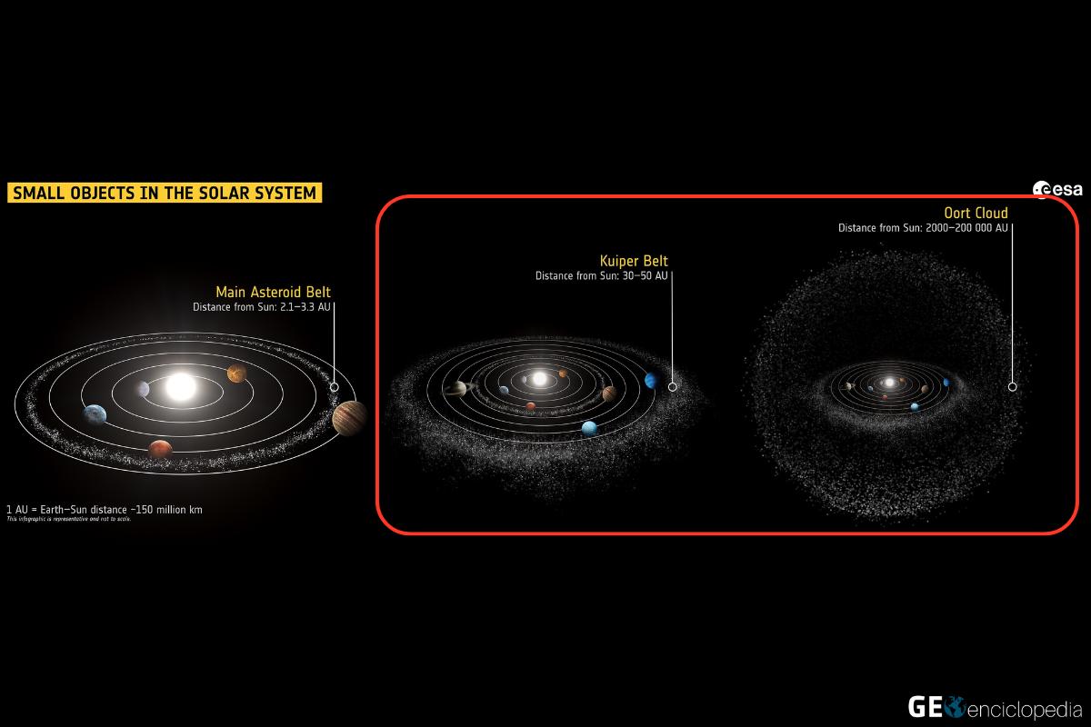 Los cometas se originan en las regiones más remotas y frías del sistema solar. La mayoría proviene de dos grandes reservorios de cuerpos helados: el Cinturón de Kuiper y la Nube de Oort.
