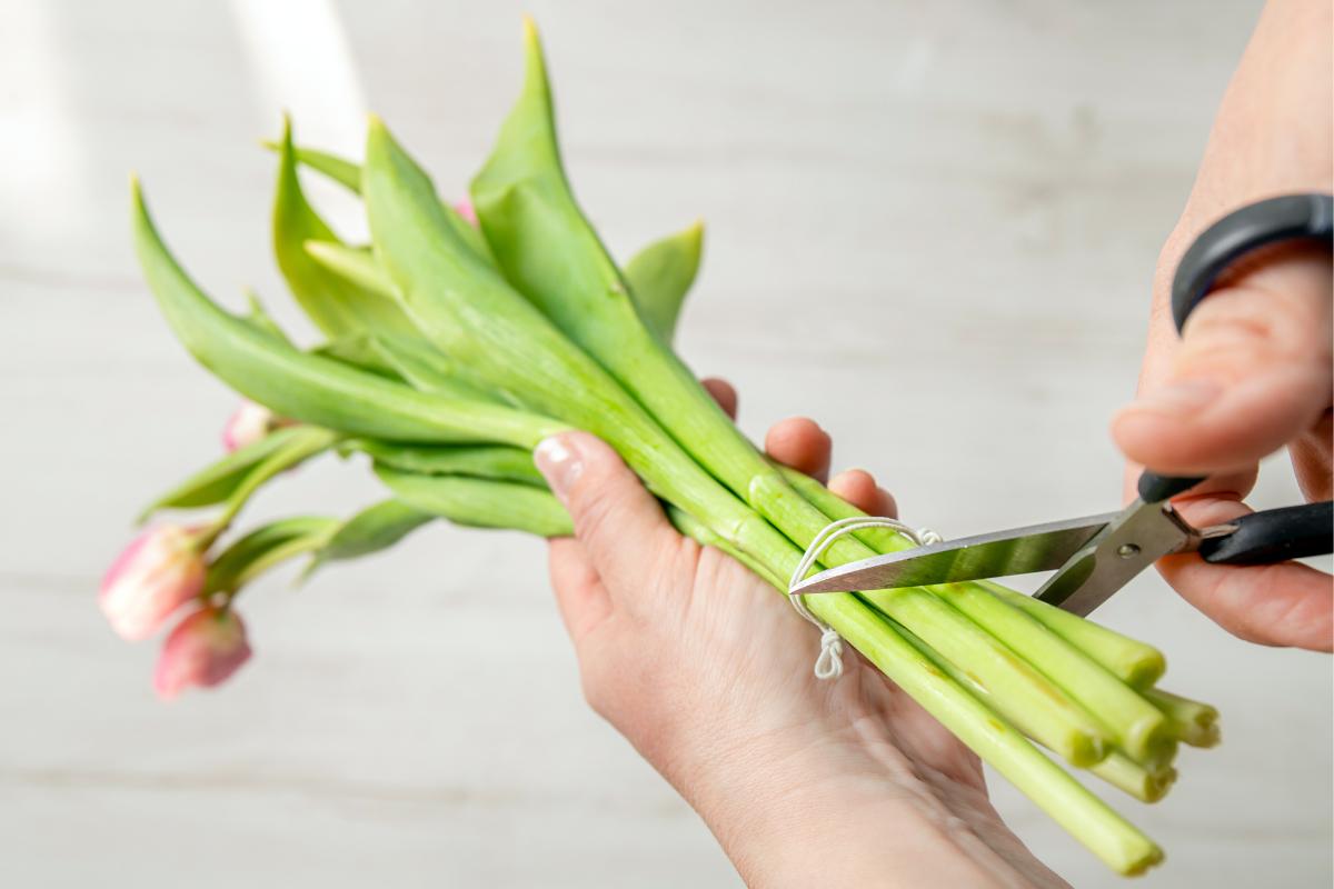 Haz un corte en diagonal en la parte inferior del tallo, en una inclinación de 45 grados. Esto facilita que el agua se transporte a través de los tejidos de la planta, porque aumenta la superficie por la que la planta puede absorber agua. Usa un cuchillo afilado o tijeras para hacer un corte limpio, porque cualquier daño en el tallo provocará la pudrición de esa zona, y por tanto la pérdida acelerada de las flores.
