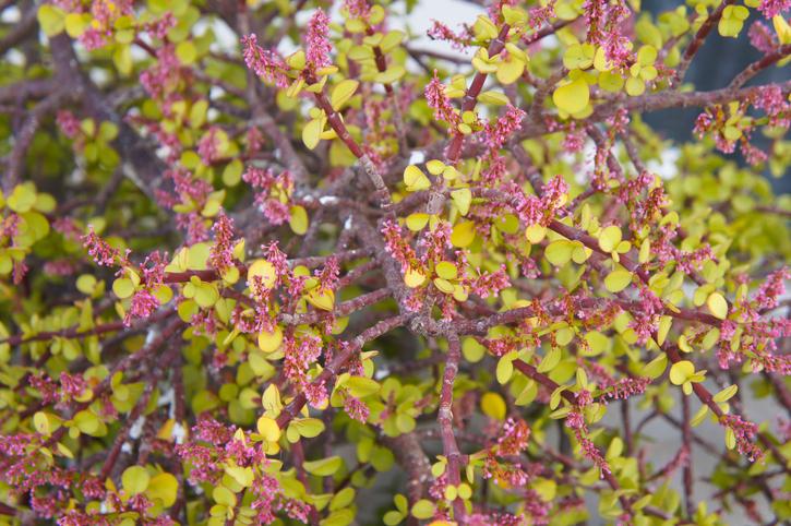 - El arbusto florece tras pasar los meses de frío, produciendo unas flores de pequeño tamaño y un color rosado muy llamativo, que se agrupan en inflorescencias al final de las ramas.