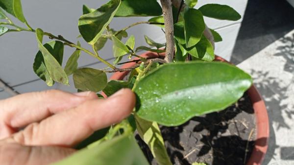 no puedo identificar el tipo de plaga. las hojar y el fruto tienen una apariencia de rocio pegajoso transparente. no he notado animalitos en sus hojas. veo ocacionalmente mosca blanca, pero no se paran en el limon sino en la tierra. anexo una foto que muestra su apariencia y expandiendo la foto se daran cuenta del rocio del que les he hablado. les doy las gracias por lo que se permitan aconsejarme y darme una solucion, gracias.