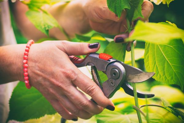 - Una vez listas las herramientas, lo importante es elegir los tallos adecuados para los esquejes. Elige una rama que cuente con al menos tres nudos y en la que haya yemas nuevas. Si tu hortensia no tiene ninguna rama que te guste para hacer el esqueje con tres nudos y cortas una mayor, déjale solo tres nudos al cortarla.