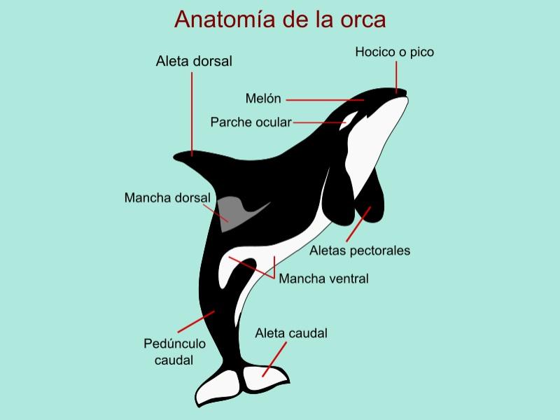 Las orcas, son caracterizadas por un parche en los ojos, en el pecho y con zonas laterales blancas y un lomo negro, una aleta dorsal larga y recta y unos dientes perfectos para atrapar presas y trocearlas para alimentarse.