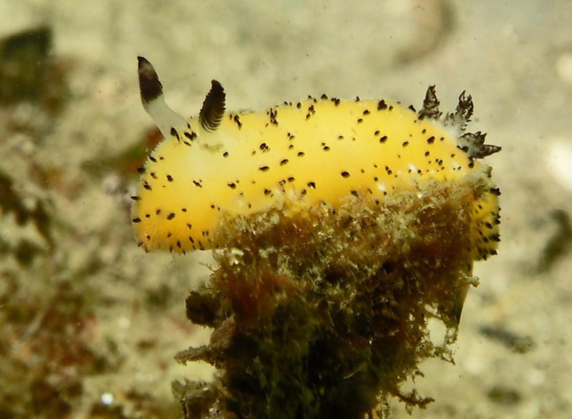 - Sobre la cabeza tiene dos prolongaciones de color negro que no son orejas. Realmente se trata de órganos sensoriales llamados rinóforos con los que detectan moléculas disueltas en el agua, a partir de las cuales pueden reconocer su entorno, detectar alimento o estar alerta de posibles peligros. Cada rinóforo tiene 15 láminas paralelas que aumentan la superficie del órgano para recibir más información del entorno.