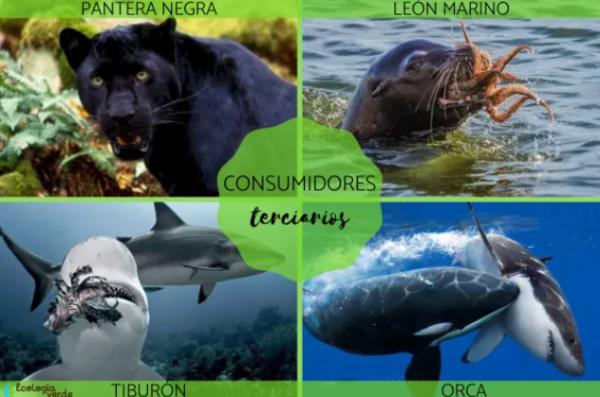 - Consumidores secundarios: son animales carnívoros que se alimentan de consumidores primarios. En este enlace podrás conocer a fondo a los Consumidores secundarios: qué son y ejemplos.