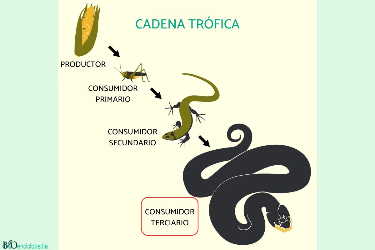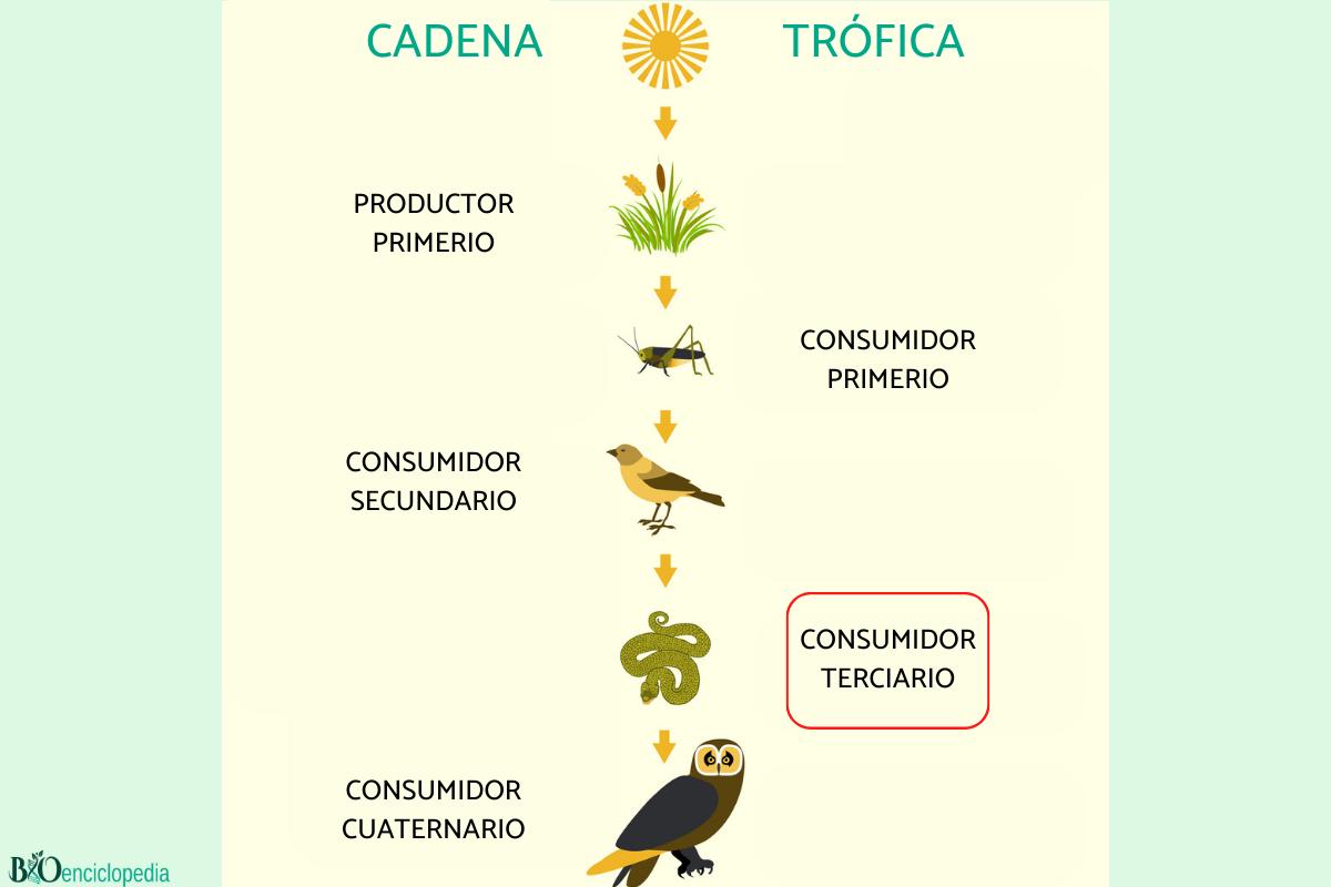En biología los animales se pueden organizar en diferentes estratos teóricos según su función en el ecosistema. De esta forma se crea el concepto de cadena trófica, en la que se representa a los organismos en diferentes niveles dependiendo de sus relaciones con el resto de los organismos de su mismo medio. En el caso de los consumidores terciarios, estamos hablando de animales que ocupan el cuarto estrato o eslabón de la cadena, por encima de los consumidores secundarios y bajo los consumidores cuaternarios, aunque estos últimos no siempre se tienen en cuenta en las cadenas tróficas.