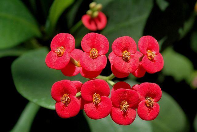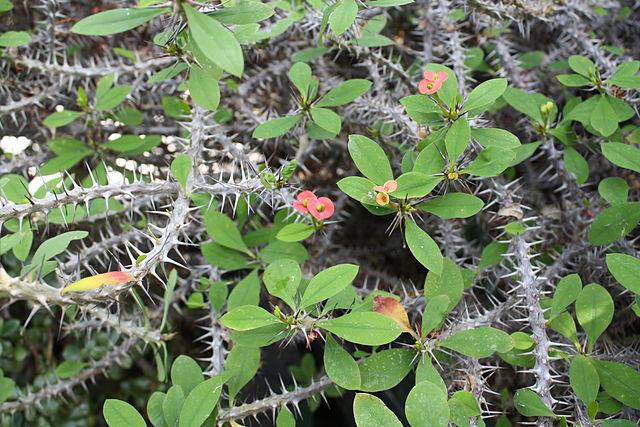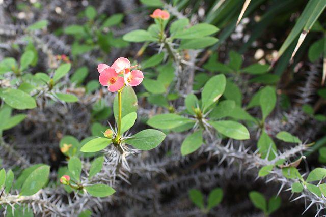 La Euphorbia milii recibe su nombre común de planta corona de Cristo o planta corona de espinas debido a que existe la leyenda de que esta fue la planta que se utilizó para la confección de su corona de espinas. Esta planta, proveniente de Madagascar, es un arbusto que llega a alcanzar, e incluso superar, alturas de 1 metro y destaca por las brácteas de color rojo o rosado de sus flores, que son muy llamativas.