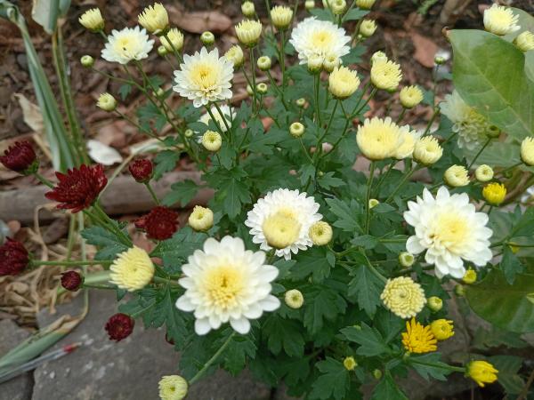 En cuanto a las especies, una de las más cultivadas en exterior, destaca Chrysanthemum x rubellum con sus hojas dentadas y flores en forma de margaritas rosas, blancas o amarillas, o Dendrathema x grandiflorum, de hojas alternas y flores dobles amarillas, rosas, rojas, naranjas o púrpuras. Un tipo de crisantemos dedicados solo con fines comerciales son los llamados crisantemos de spray, aunque con variedades menos resistentes que las anteriores.