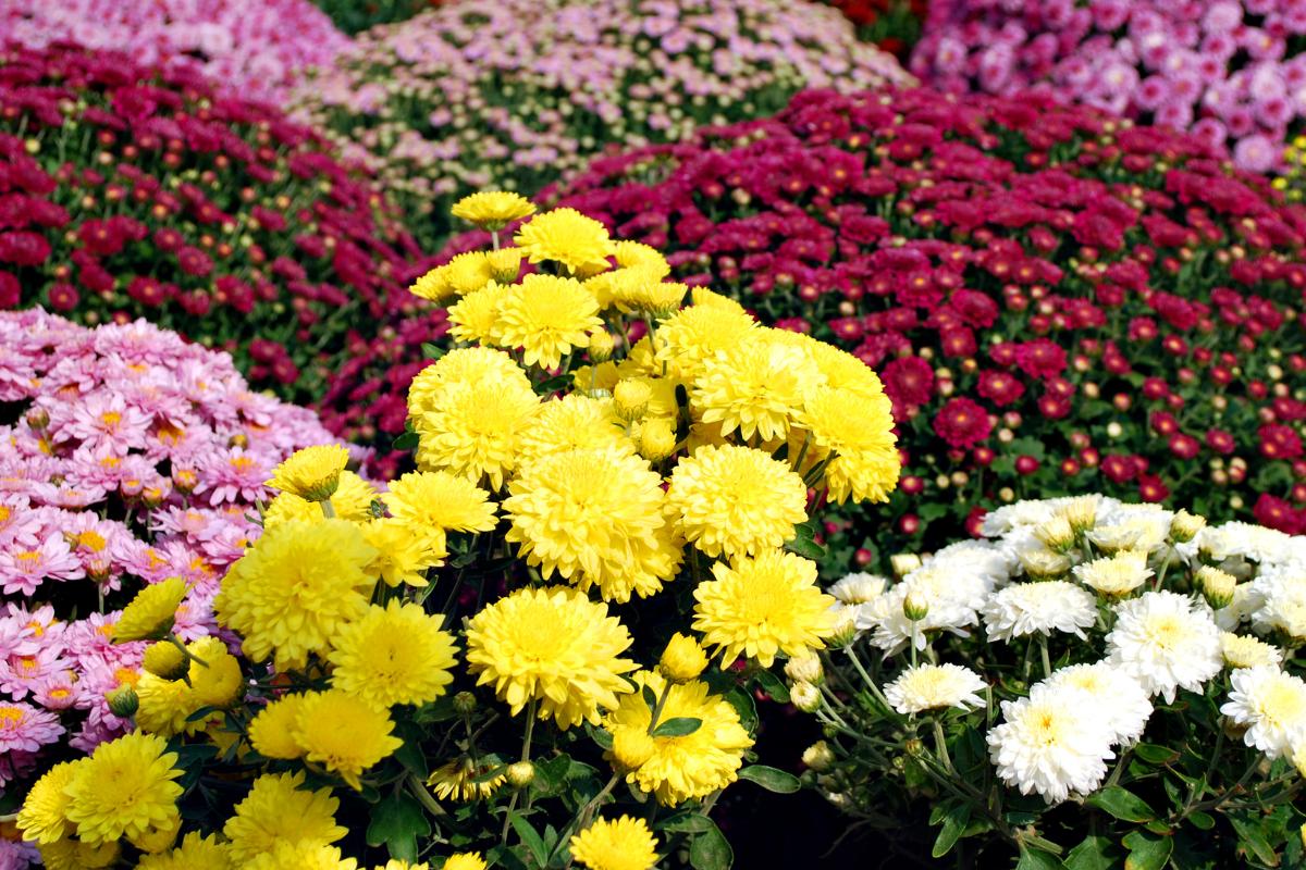 Los cuidados de los crisantemos son exposición solar completa y riego abundante. Los tipos son los de flor grande y flor pequeña. La poda se hace cuando el tallo alcance 20 centímetros de altura y se reproduce por semillas, raíces o esquejes.