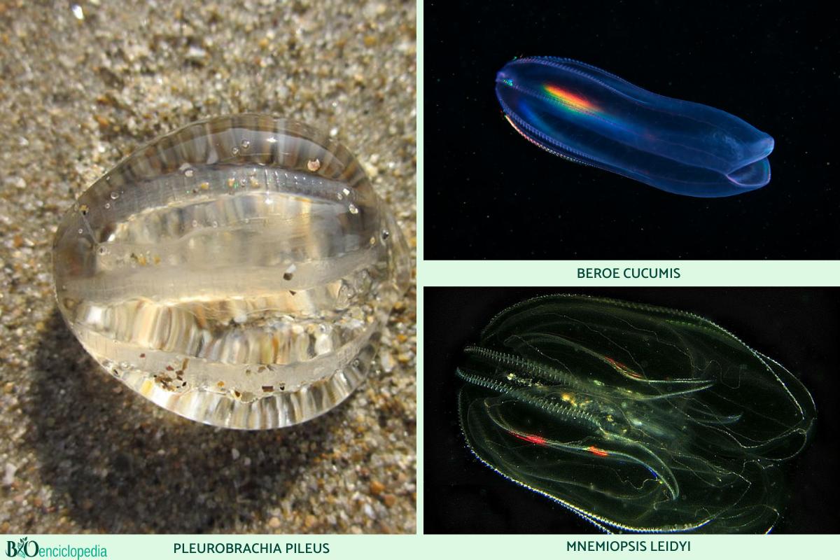 - Se caracterizan por tener ocho hileras de peines ciliados que utilizan para nadar y alimentarse y que, además, tienen la capacidad de reflejar la luz y producir destellos de colores iridiscentes.