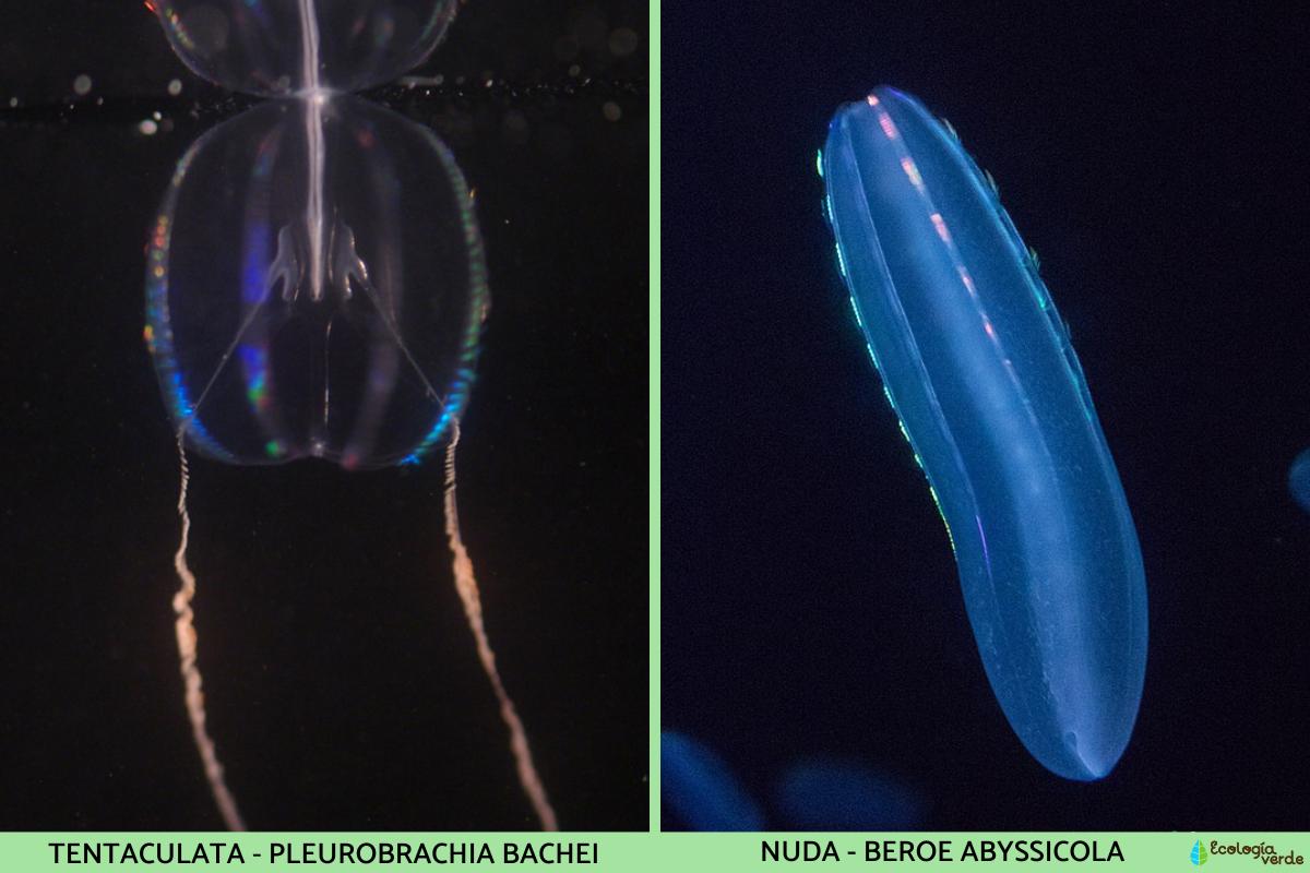 - Nuda: estas especies carecen de tentáculos y presentan una boca grande. Se alimentan de medusas y otros ctenóforos.