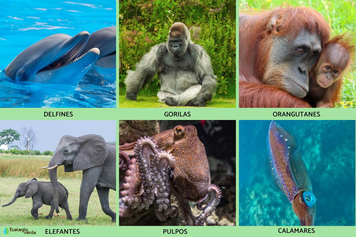 - Elefantes: los elefantes tienen uno de los cerebros de mayor tamaño dentro del mundo de los animales terrestres. Este puede alcanzar hasta 5 kilogramos y tiene una estructura similar al cerebro de los seres humanos. Los elefantes desarrollan comportamientos complejos relacionados al duelo, al juego, a la utilización de herramientas, a la memoria, el cuidado maternal, entre muchas otros. Todo esto indica que los elefantes son animales muy inteligentes, tanto como los cetáceos y los primates.