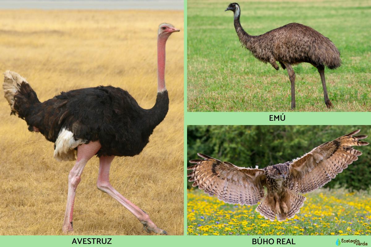 - Avestruz: el avestruz (Struthio camelus) es el ave más grande y pesada del mundo. Se le considera "peligrosa" debido a la gran fuerza de sus patas, las cuales están equipadas con poderosas garras capaces de ocasionar heridas graves o incluso acabar con la vida de un depredador potencial si se siente amenazada.