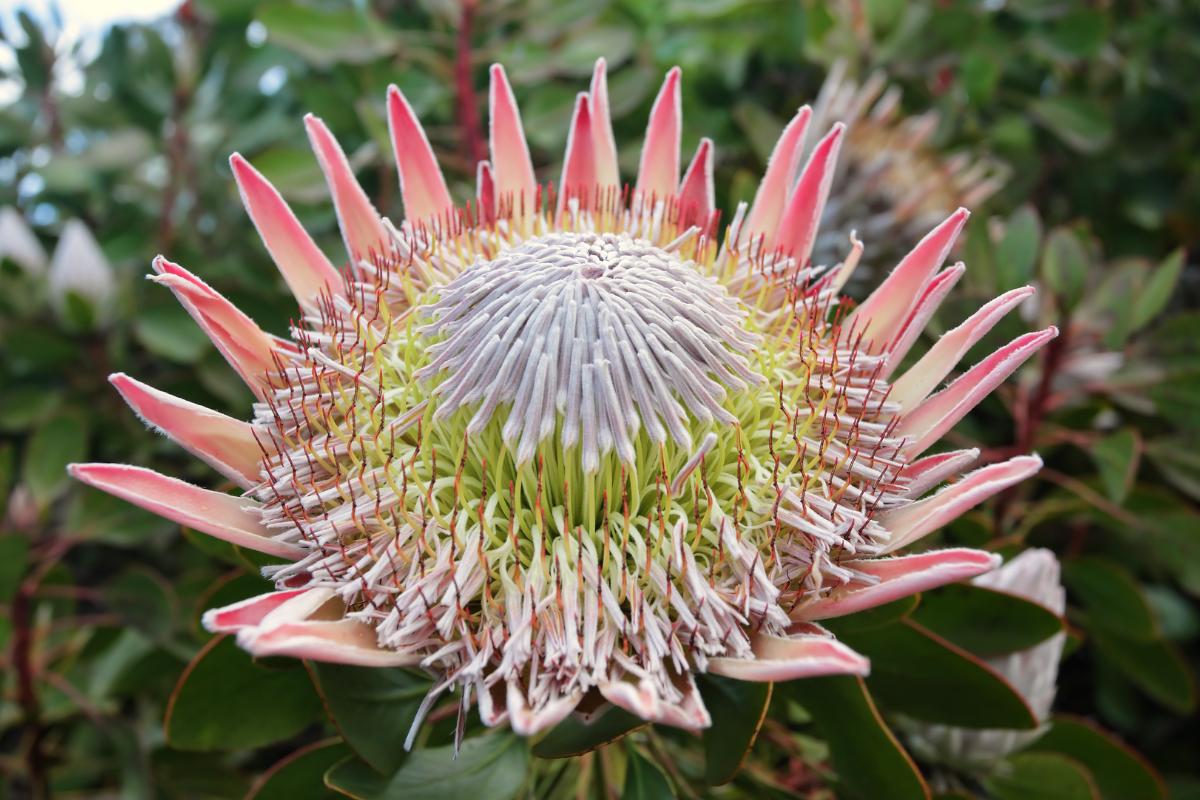 Se trata de una planta nativa de climas áridos sudafricanos, que mide 30 centímetros de diámetro. Realmente son inflorescencias y no propiamente flores. Al exterior podemos ver las brácteas rígidas de color rosa aterciopelado, que en forma recuerdan a una alcachofa. Dentro se encuentran las flores, que se ven como filamentos de color blanco y amarillo. Hay variedades creadas por el hombre que juegan con diferentes tonalidades de rosa, pudiendo encontrarse moradas, o casi rojas.