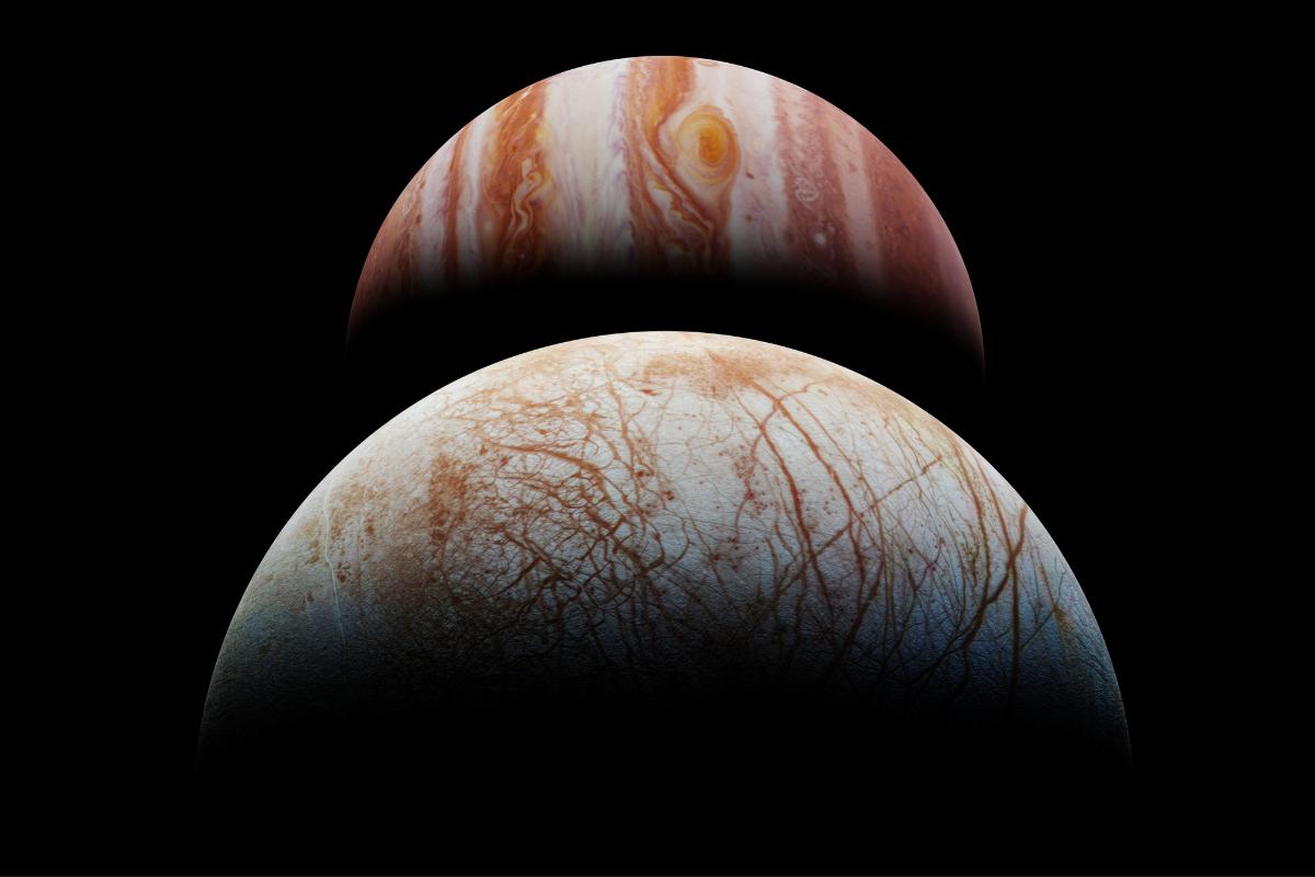 Europa o Júpiter II, a pesar de ser el satélite galileano más pequeño, con un diámetro de 3.122 km, es una de las lunas de Júpiter que suscita mayor interés. Pero, ¿por qué es tan atractiva? La comunidad científica ha mostrado especial atención en esta luna porque se ha creído siempre que bajo la superficie brillante de hielo de 100 km de espesor existía un gran océano[2] donde, debido al calor que expende el núcleo formado por níquel y hierro, es posible la vida. Esto fue confirmado por la NASA en 2016, lo que ha incrementado las esperanzas de que se desarrolle vida acuática en el satélite, a pesar de que todavía no hay evidencias científicas.