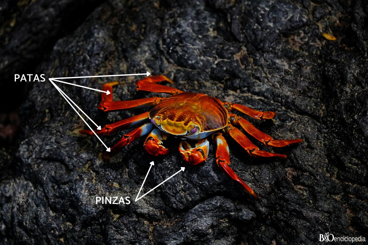 Los cangrejos pertenecen taxonómicamente al grupo decápoda, que al descomponer esta palabra en su raíz etimológica damos con que deca significa diez y poda patas, es decir, diez patas. Estas 10 patas se agrupan en 5 pares, cada par a cada lado del cuerpo, y están sujetas a los últimos 5 segmentos del tórax, que es el segmento medio de los artrópodos ubicado entre la cabeza y el abdomen.