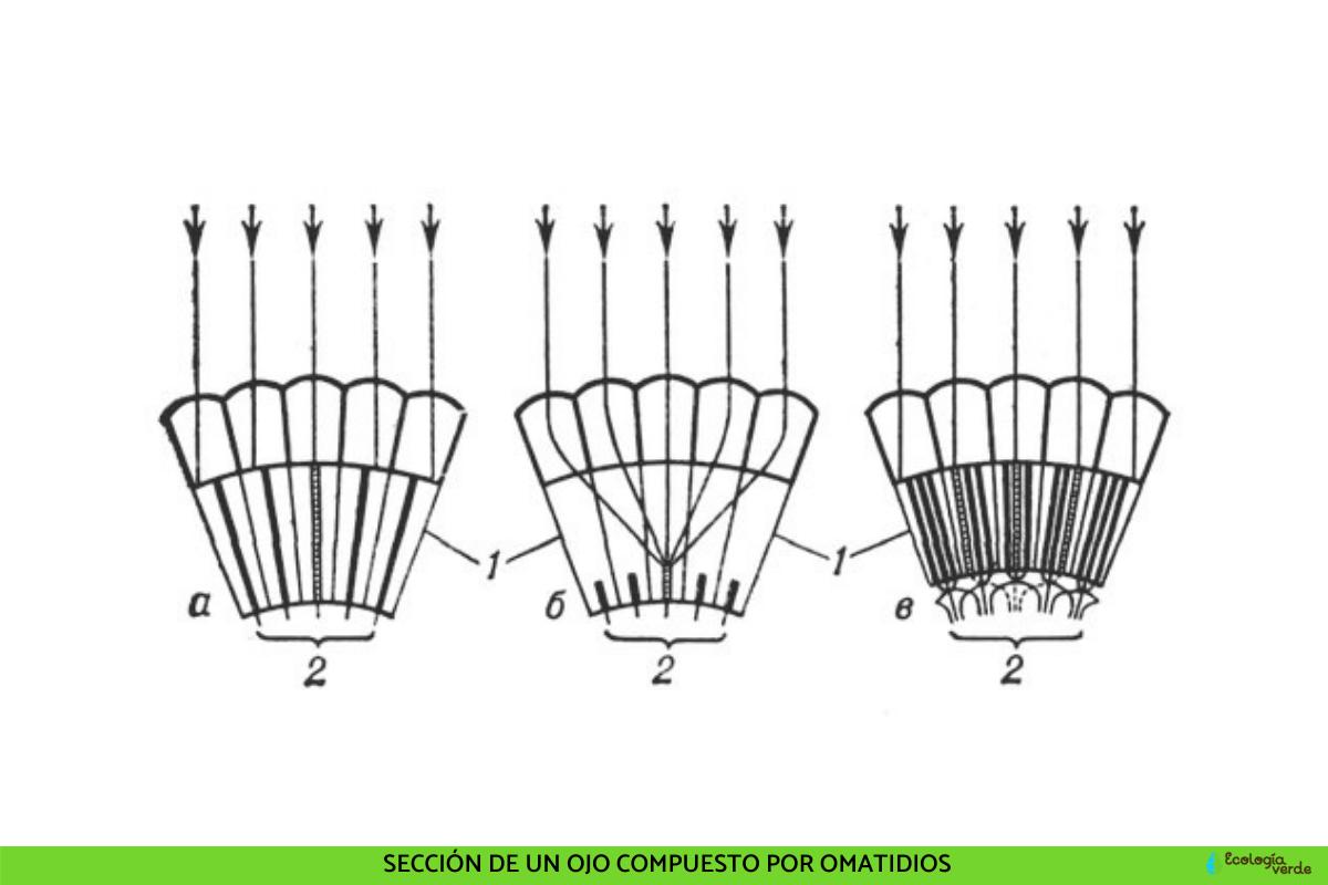 Estos ojos minúsculos y simples se denominan omatidios, son de forma hexagonal y se acomodan en círculo. Cada uno de ellos se compone de: