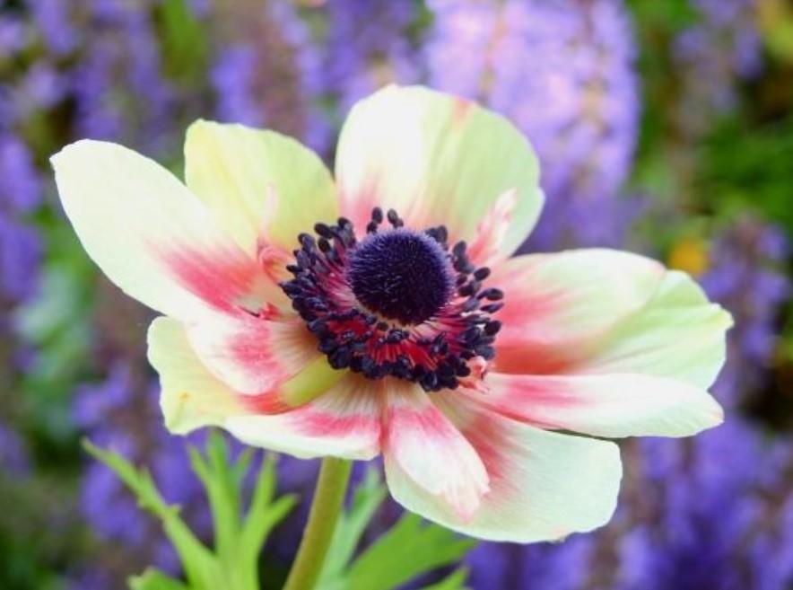 - La flor de la anemone coronaria es de color morado o lila, de forma muy parecida a la de la amapola y de hasta casi 10 cm de diámetro. Son flores solitarias, que crecen en plantas que rara vez superan los 40 cm de altura.