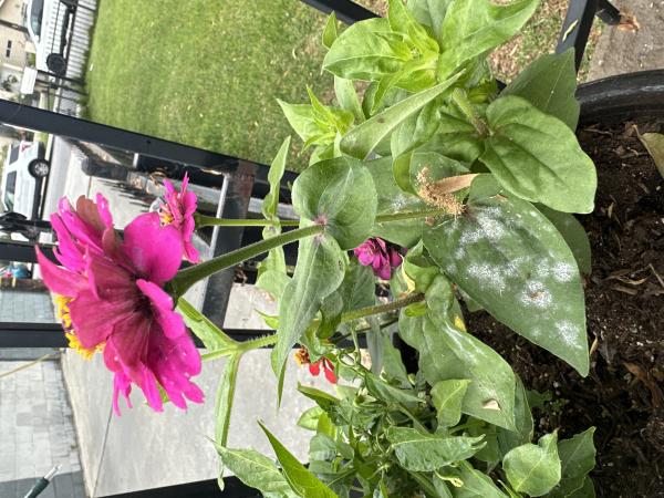 Las hojas de mis flores dalias le han salido manchas blancas que me recomiendan ponerles gracias 🌼🌸🌺