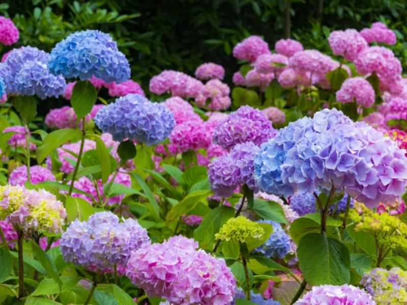 Las flores de las hortensias forman grandes inflorescencias de colores vivos y muy llamativos, cuyos tonos dependen del pH del suelo en que están, aunque existen fertilizantes ricos en determinados elementos que ayudan a alcanzar la coloración deseada.