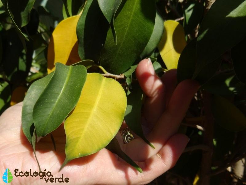 Por otro lado, una de las enfermedades del ficus benjamina se presenta en forma de hojas amarillentas. Si ves hojas amarillas en tu ficus benjamina, piensa que suele deberse a la falta de agua, por exceso de sol o bien, por falta de algún nutriente en la tierra, por lo general hierro. Cuando suceda esto, lo más recomendable será asegurarse primero de que la planta cuenta con el agua necesaria y, si es así, entonces aplicar un abono específico que sea rico en hierro, además de que cuente también con un contenido elevado de nitrógeno. A la hora de aplicar el abono, es importante repetir que es preferible quedarse cortos en la cantidad y ver cómo reacciona que pasarse de cantidad. Si es necesario, se podrá aplicar más abono en pequeñas cantidades pasado un mes o dos.