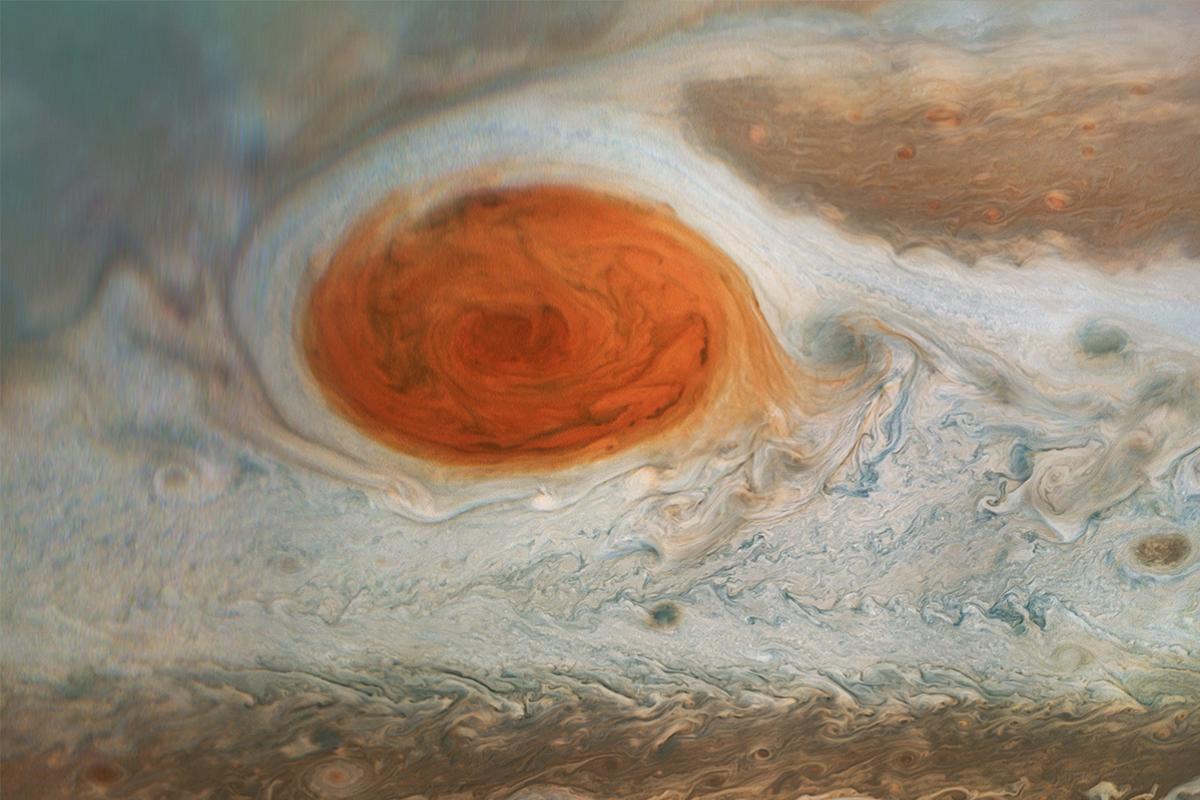 La atmósfera de Júpiter es muy peculiar. Compuesta principalmente de hidrógeno (90%) y helio (10%), alberga trazas de amoníaco, metano, vapor de agua y otros compuestos que interactúan con la radiación solar y dan como resultado bandas de colores. Estas bandas, conocidas como zonas (claras) y cinturones (oscuros), son el resultado de potentes corrientes de chorro que circulan a más de 500 km/h. Además, las tormentas y remolinos que surgen en esta atmósfera pueden durar años o incluso siglos, haciendo de Júpiter un laboratorio natural para estudiar la meteorología extrema.