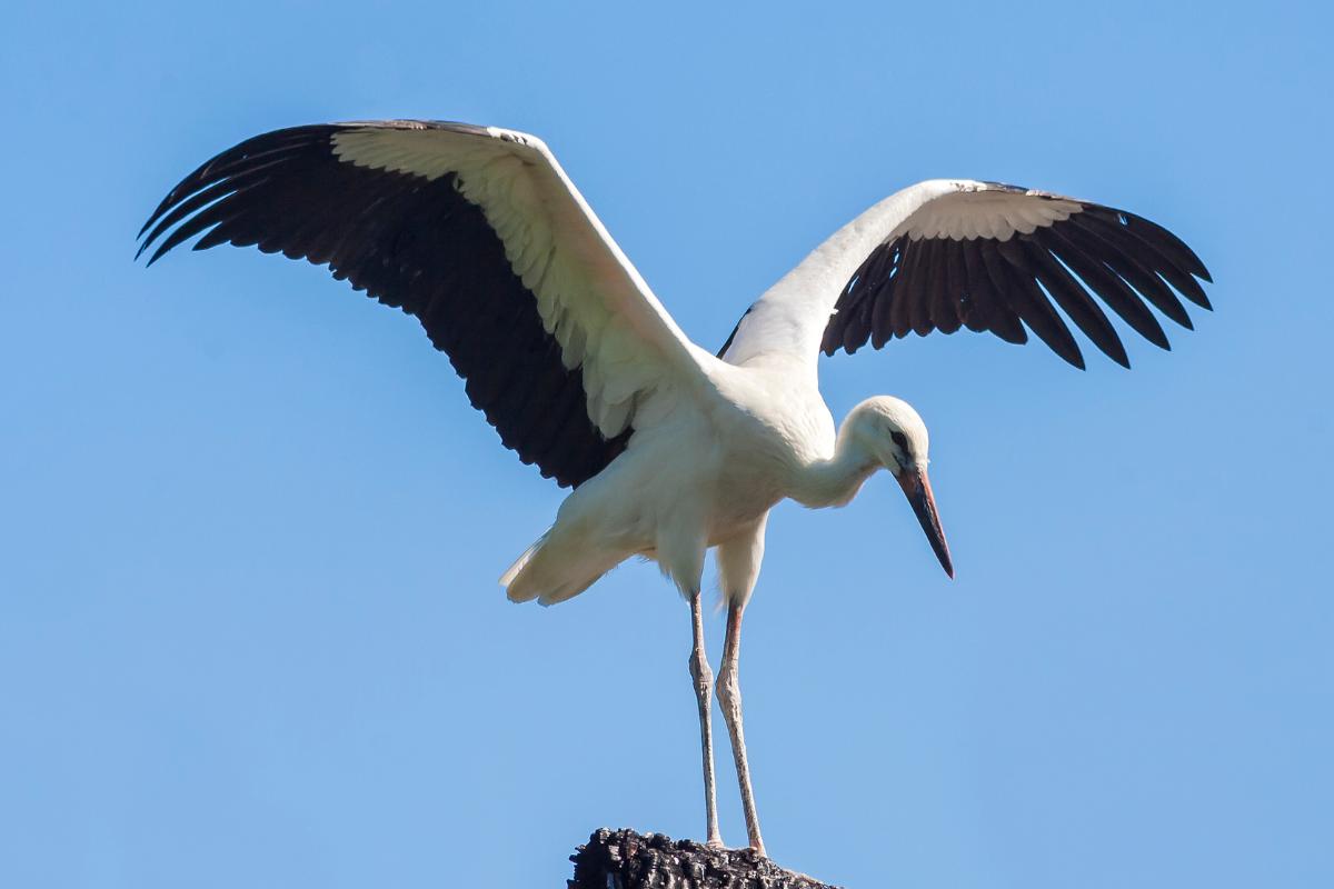 Su crecimiento es vertiginoso. Al mes, los pollos baten las alas y adquieren las primeras plumas de vuelo; al segundo mes, practican vuelos breves asistidos por sus padres; y entre los 58 y 64 días las cigüeñas abandonan definitivamente el nido para realizar su primer vuelo autónomo. A los tres meses ya son totalmente independientes.