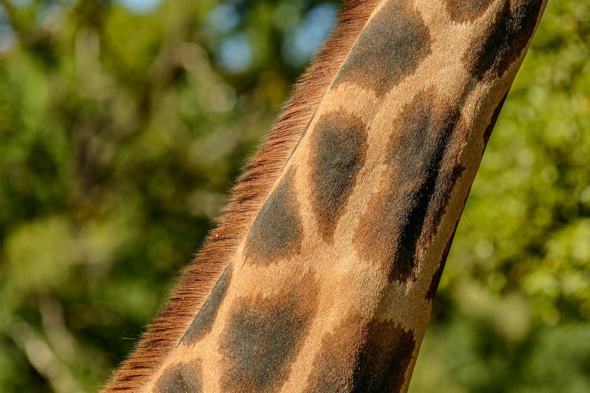 El pelaje de la jirafa se caracteriza por presentar manchas oscuras (que pueden variar entre tonos naranja, castaño, marrón o negro) separadas por áreas de pelo claro, generalmente blanco o crema. Este patrón no solo funciona como camuflaje en los bosques de sabana, sino que también cumple funciones térmicas y defensivas. Debajo de las manchas oscuras, la piel alberga una red de vasos sanguíneos y glándulas sudoríparas que influyen en la termorregulación. Además, su piel gruesa y gris le permite moverse entre arbustos espinosos sin sufrir daños.