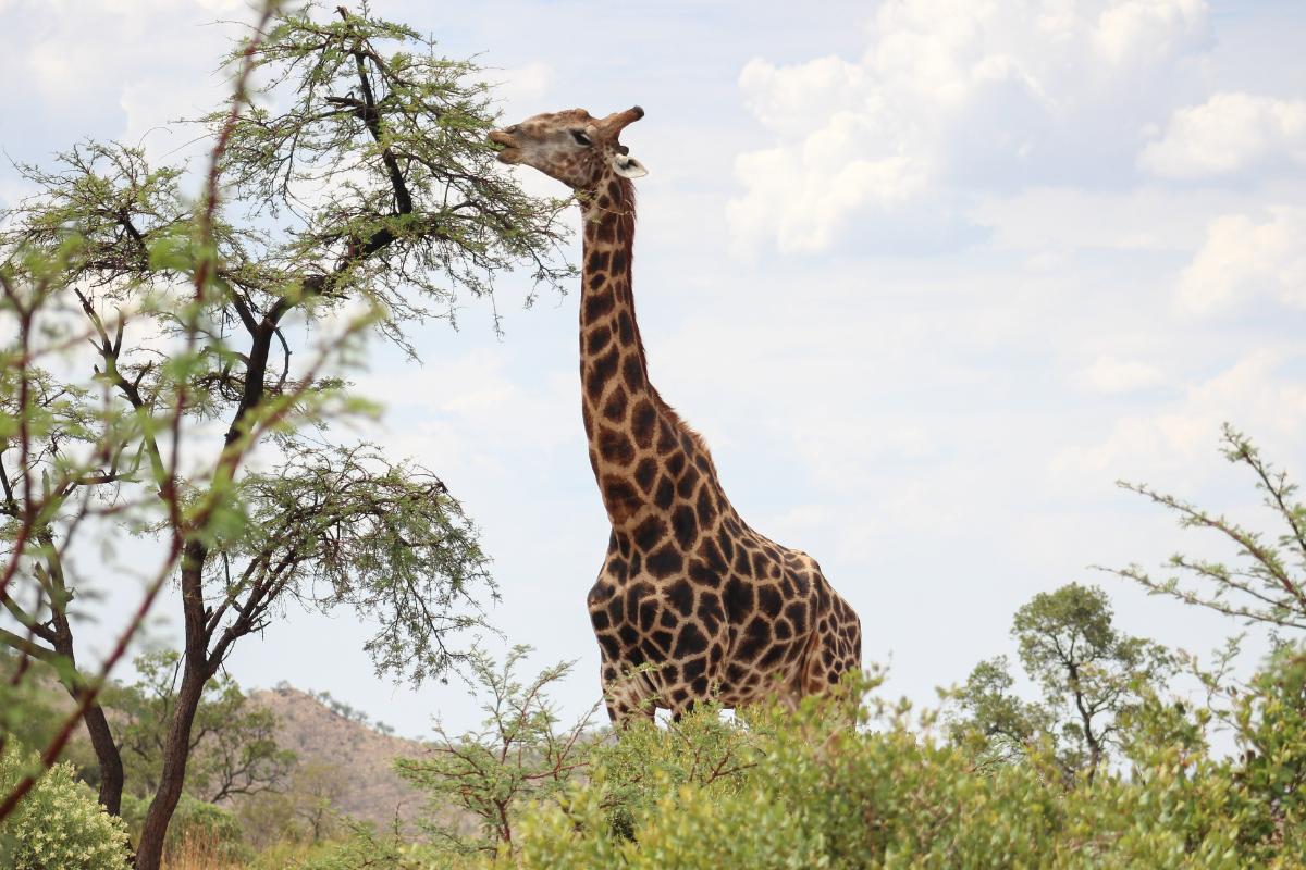 Otra de las características de las jirafas es que son herbívoras y en su dieta incluyen hojas, tallos, flores y frutos. Aunque se ha registrado que pueden consumir hasta 93 especies vegetales diferentes, alrededor del 75% de su alimentación se basa en solo media docena de especies. Entre ellas, la acacia es una de las más consumidas a lo largo de su área de distribución. Durante la estación seca, también recurren a otras plantas pertenecientes a diferentes géneros como Faidherbia, Boscia, Grewia y Kigelia, adaptando su alimentación a la disponibilidad de recursos en su entorno.