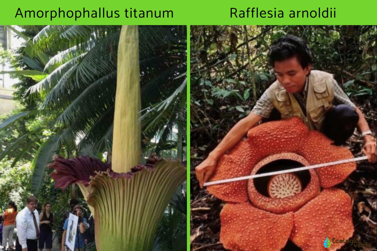- Las plantas llamadas Titan Aurm (llamada aro gigante, bunga bangkai, flor cadáver o Amorphophallus titanum) y Rafflesia arnoldii son las consideradas como la flor más grande del mundo. La primera llega a alcanzar hasta 3 metros de altura y la segunda tiene una flor de más de 90 centímetros de diámetro y supera los 10 kilos de peso.