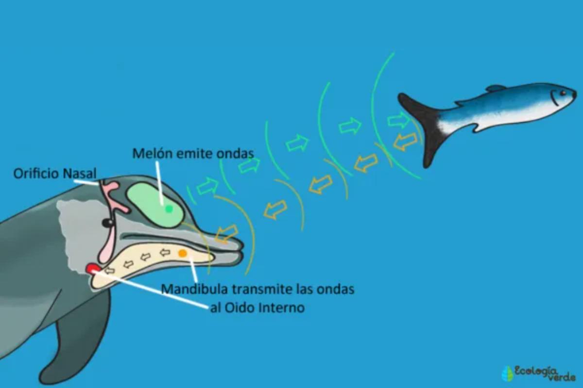 Los delfines exhiben una notable habilidad conocida como ecolocalización que utiliza el “melón”, un órgano graso ubicado en la cabeza, que actúa emitiendo sonidos de alta y baja frecuencia e interpreta las ondas sonoras que regresan después de colisionar con objetos de su entorno. La ecolocalización, desempeña un papel fundamental en diversas funciones como en la navegación y la localización de presas.