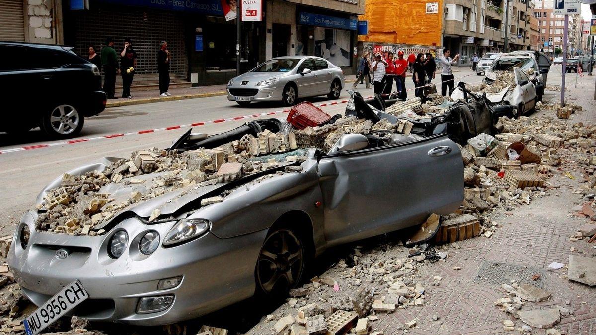 Imagen: Coches destrozados por los cascotes desprendidos de un edificio en la Avenida Juan Carlos I de Lorca tras el terremoto que afectó a la ciudad / Agencia EFE