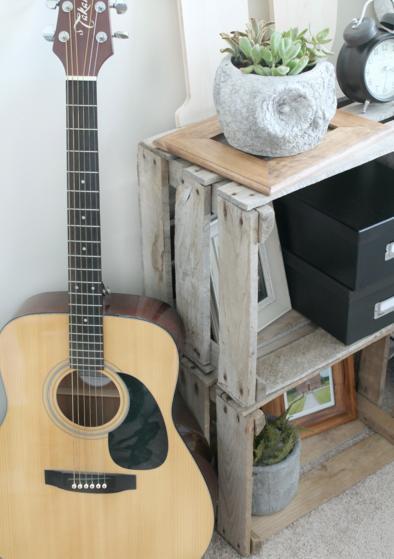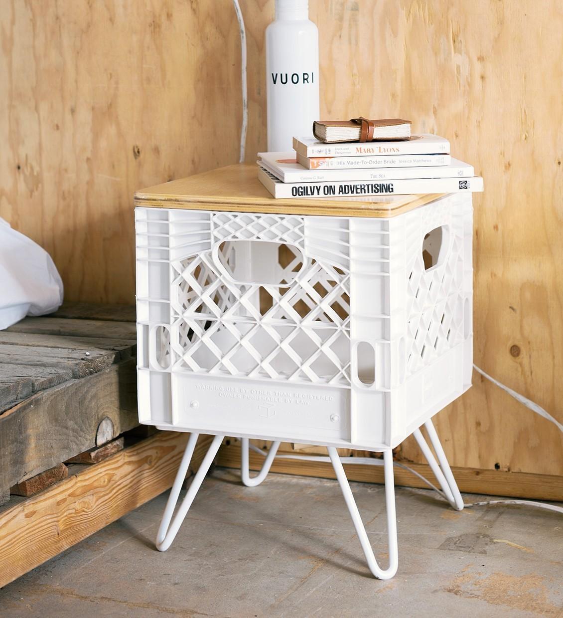 Quizá no se te había ocurrido que estas cajas pueden hacernos las veces de mesa de noche. Nada más simple. Sólo necesitamos restaurarlas y elegir el lateral que esté en mejor forma para que haga de soporte de nuestras lámparas de noche, libros y despertadores.