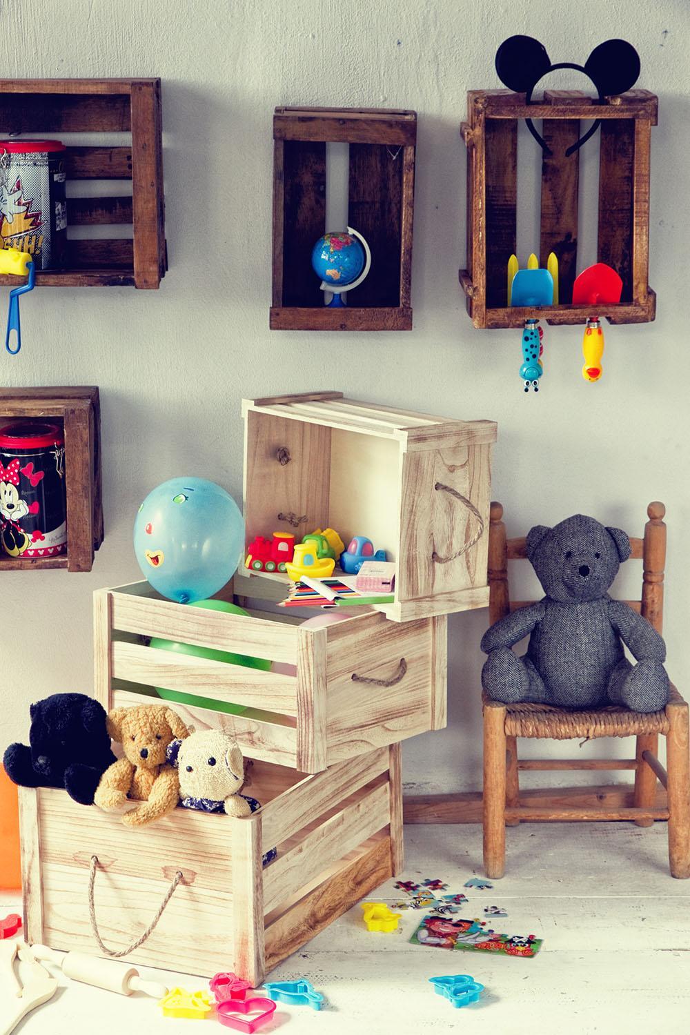 Una gran caja que guarde la mayoría de muñecas y juguetes es una idea de gran utilidad que podrá solucionarnos el problema de los juguetes siempre desperdigados por la habitación de una vez por todas. Sólo tenemos que limpiarla y decorarla muy bien (incluso forrarla con goma espuma y telas, especialmente si los niños son muy pequeños) y tendremos un juguetero perfecto y muy útil.