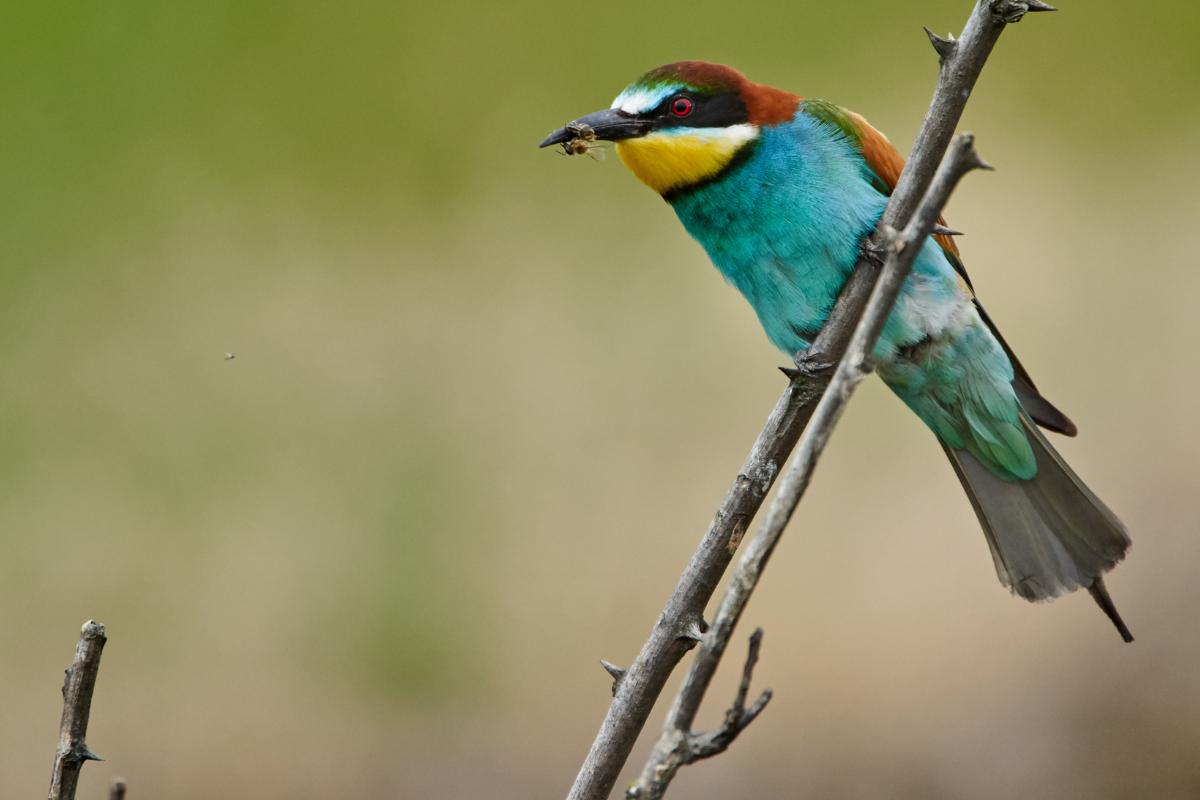 Merops apiaster, conocido comúnmente como abejaruco europeo es un ave que presenta colores muy llamativos en su plumaje y que se distribuye desde la Península Ibérica y el norte de África hasta el centro y sudoeste de Asia, alcanzando el sur Afganistán y Omán, Sudáfrica y Namibia. Tal como lo indica su nombre común, es especialista en el consumo de abejas y avispas aunque también consume libélulas y moscardones en vuelo. Esta especie suele generar conflictos con los apicultores, ya que se presenta con frecuencia a las colmenas para alimentarse de las abejas. Por otro lado, el abejaruco también caza a la avispa asiática (Vespa velutina), transformándose en un biocontrolador de este insecto exótico invasor.