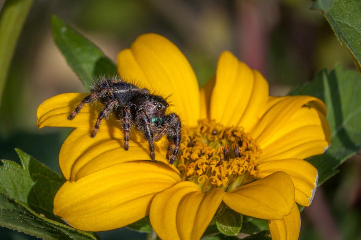 Las arañas del género Phidippus, como la araña saltarina (Phidippus audax) nativa de América del Norte, son pequeñas cazadoras activas que se alimentan de diversos insectos, incluidas abejas y avispas de menor tamaño. Estas arañas no construyen telarañas para atrapar a sus presas, sino que las buscan activamente, las acechan y saltan sobre ellas con gran precisión. En jardines y espacios urbanos pueden capturar polinizadores, especialmente cuando estos se posan sobre flores.