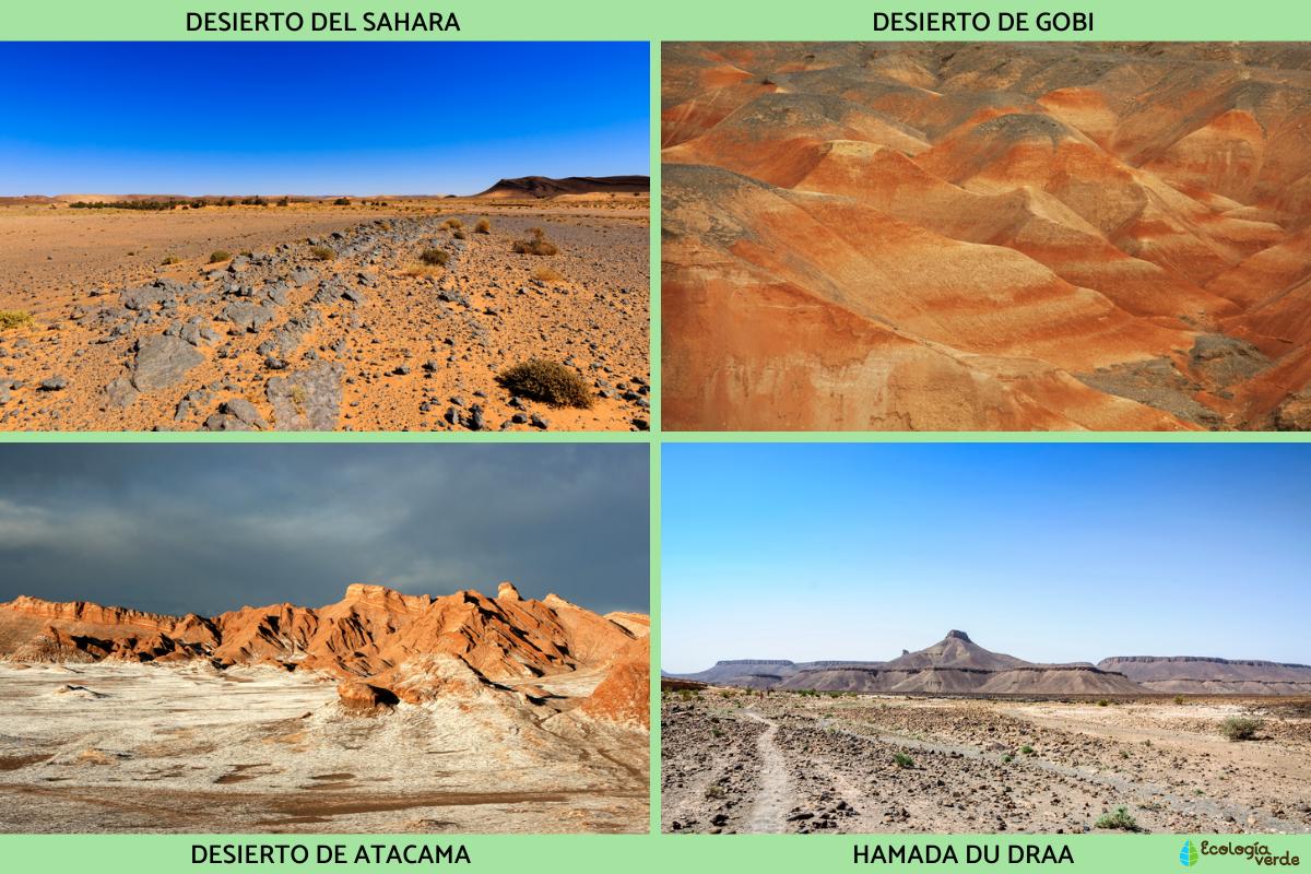 - Desierto del Sahara (África): el desierto del Sahara es el desierto cálido más grande del mundo, con una extensión de aproximadamente 9,2 millones de km². Aunque suele asociarse con dunas de arena, en realidad más del 70 % de su superficie es pedregosa. En este enlace podrás conocer a los Animales del desierto del Sáhara.