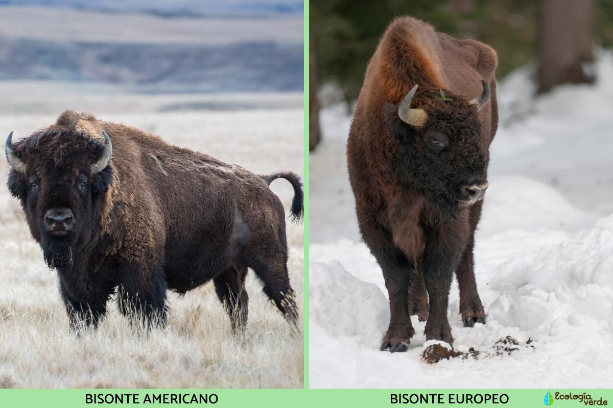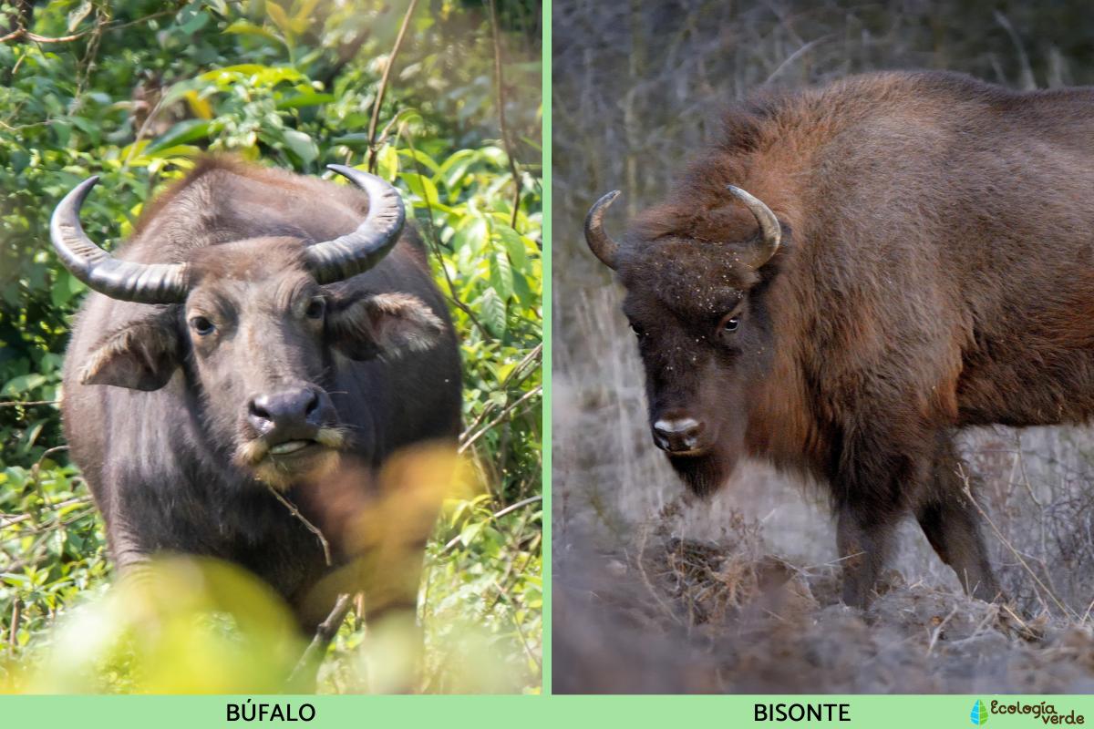 Dentro de las diferencias entre el búfalo (Bubalus bubalis) y el bisonte (Bison sp.) encontramos que poseen una distinta distribución geográfica y preferencia de hábitat, los cuernos son más grandes en los búfalos, el pelaje es distinto en ambas especies siendo más denso en bisontes, entre muchas otras. Si quieres saber cuál es la diferencia entre búfalo y bisonte, te invitamos a leer este artículo de EcologíaVerde que te será muy útil.