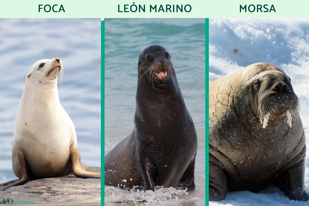 La diferencia entre foca, león marino y morsa es que las morsas tienen grandes colmillos, mientras que el león marino tiene pequeñas orejas, y las focas carecen de ellas. La foca, el león marino y la morsa son mamíferos marinos que viven en las costas de diferentes mares y adaptadas al entorno acuático, con cuerpo aerodinámico que termina en una cola, sin extremidades posteriores. Las extremidades delanteras son como pequeñas aletas, y son hábiles nadadores. Sin embargo, hay muchas diferencias entre estos tres animales. Si quieres conocerlas, te invitamos a leer este artículo de BIOenciclopedia donde aprenderás más sobre la diferencia entre foca, león marino y morsa.