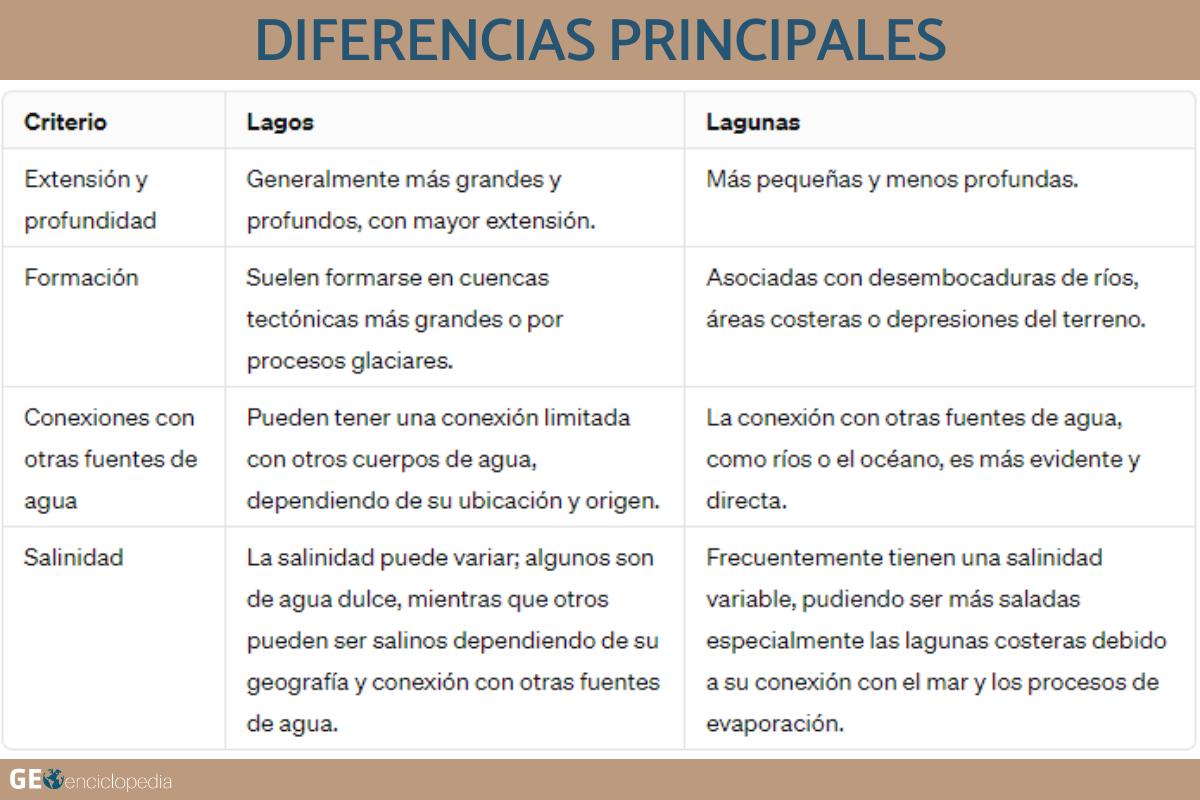 La diferencia principal entre un lago y una laguna radica en su tamaño, profundidad y conexiones hidrológicas. Por ejemplo, un lago es generalmente más grande y más profundo que una laguna. Otra diferencia que puede considerarse es la variabilidad en la salinidad.
