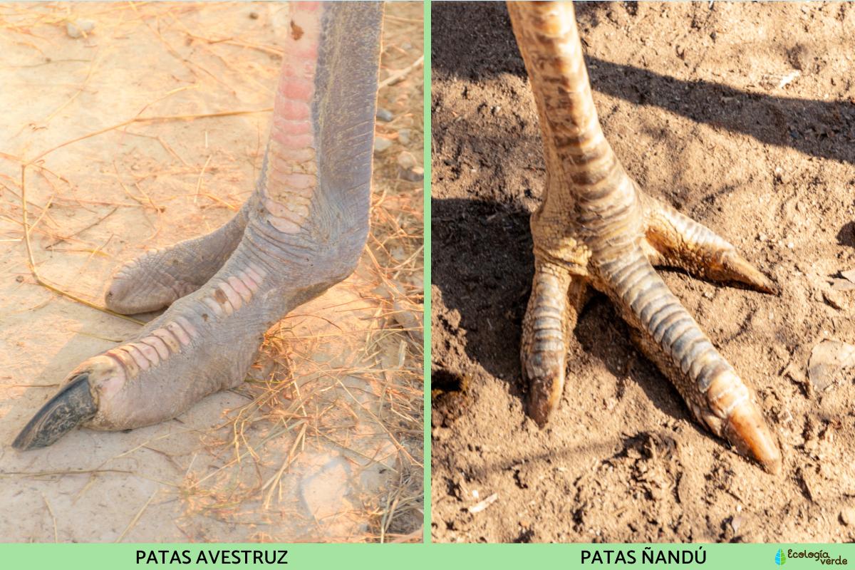 El avestruz tiene solo dos dedos en cada pata, una característica única entre las aves actuales. Esta adaptación le permite correr a gran velocidad, ya que su dedo principal es muy largo y actúa casi como una pezuña, optimizando el contacto con el suelo. Por su parte, el ñandú tiene tres dedos en cada pata, como la mayoría de las aves corredoras. Esto le da más estabilidad, aunque no alcanza las mismas velocidades que el avestruz.
