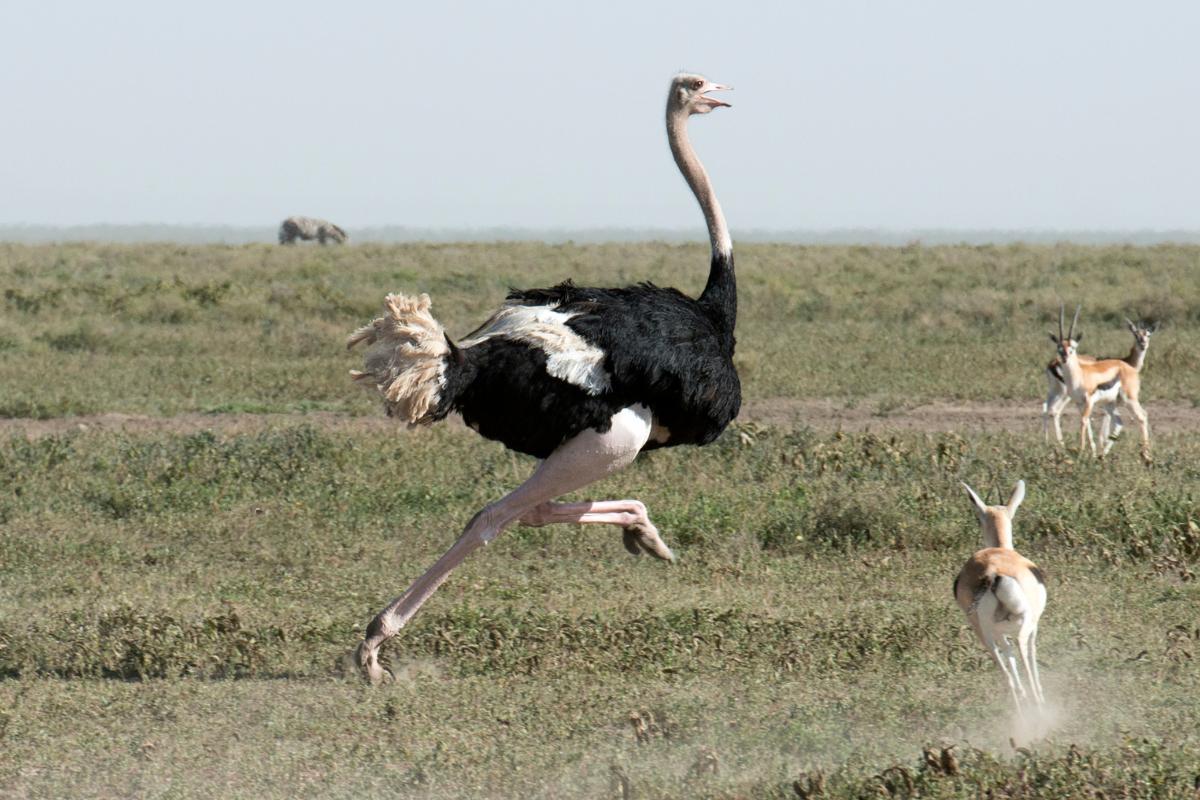 El avestruz es el ave terrestre más rápida del mundo: puede correr a velocidades de hasta 70 km/h, gracias a sus patas largas, potentes y adaptadas para dar grandes zancadas. Esta capacidad le permite huir de depredadores con eficacia en las extensas sabanas africanas.