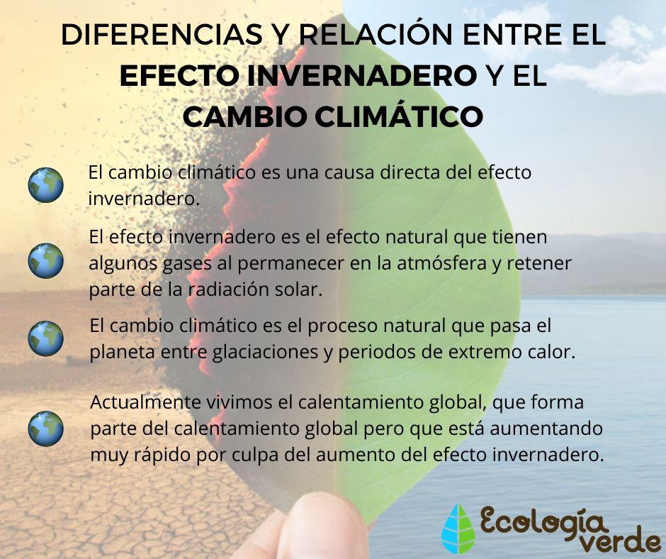 Así pues, una vez definidos ambos conceptos, podemos ver realmente qué relación tienen y en qué se diferencian. Toma nota de este resumen sobre las diferencias entre el efecto invernadero y el cambio climático y su relación: