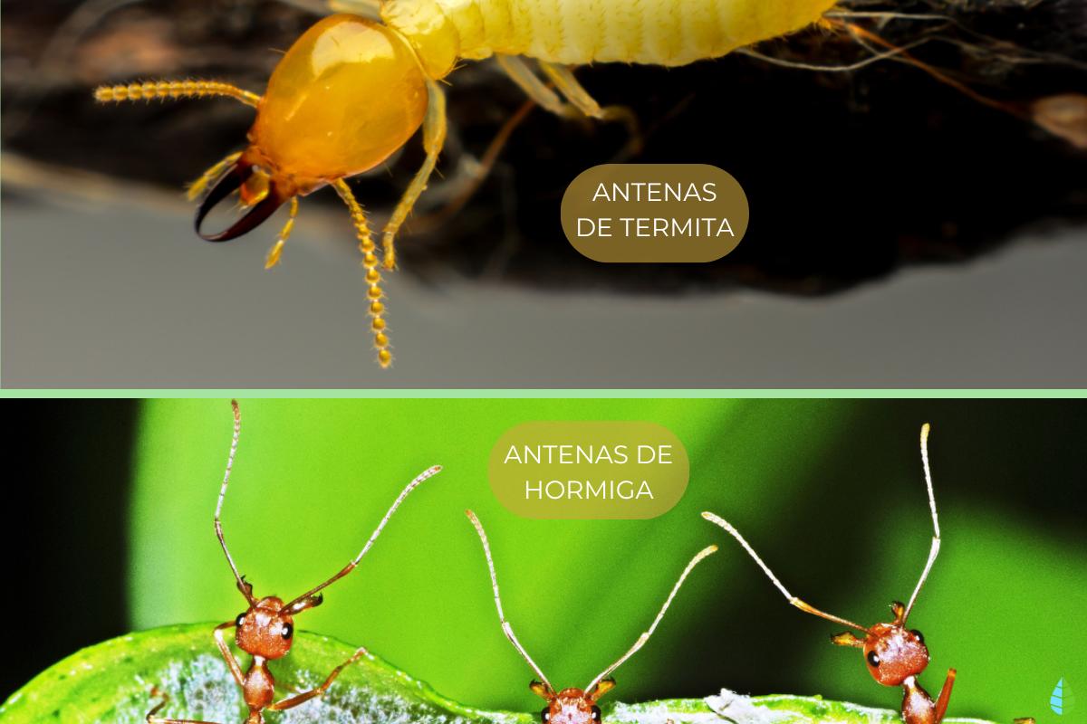Las termitas tienen antenas rectas, formadas por una cadena simple de segmentos que parecen pequeñas cuentas. Estas antenas se extienden de manera recta desde la cabeza, sin curvas ni dobleces. Además, las antenas de las termitas no presentan esa flexibilidad, lo que hace que se mantengan rectas y sin la curvatura característica de las hormigas.