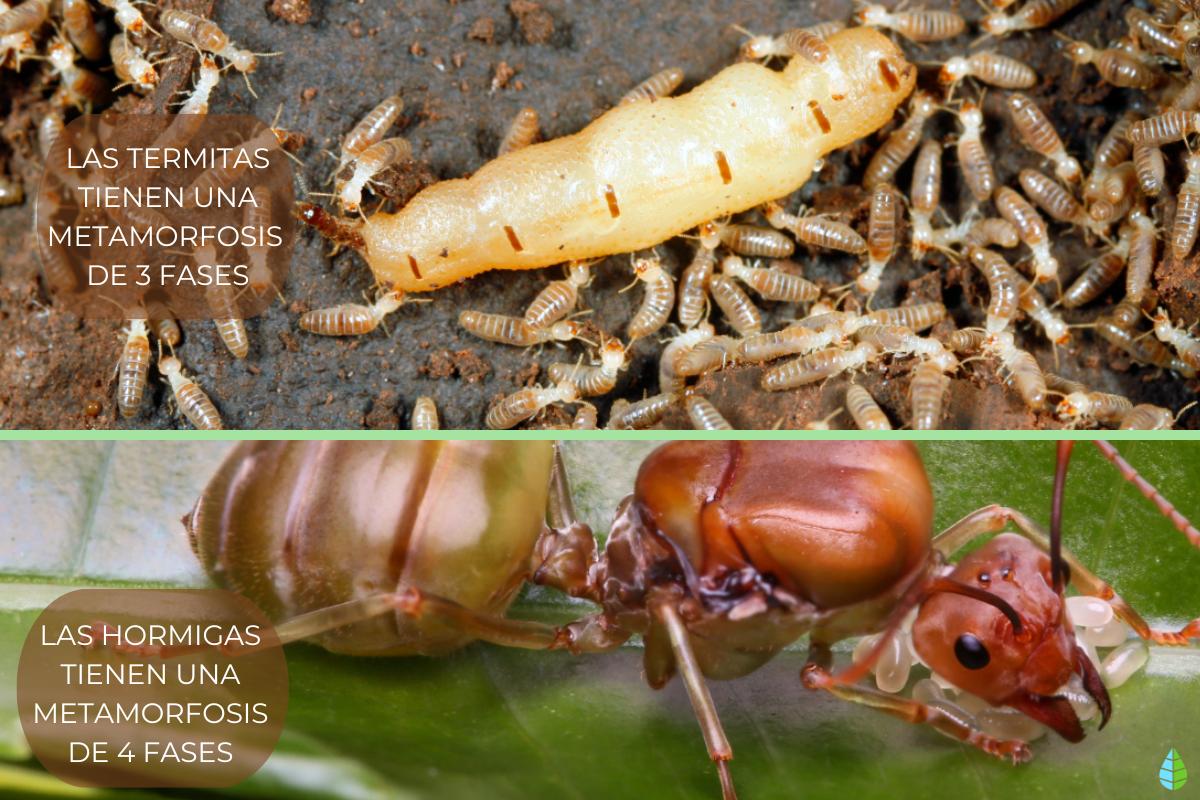 En cuanto a las etapas de su ciclo vital, las hormigas pasan por 4 fases: huevo, larva, pupa y adulto, mientras que las termitas experimentan una metamorfosis incompleta, pasando de huevo a ninfa y luego a adulto, sin una fase de pupa. Las hormigas desarrollan sus larvas en una o dos semanas y atraviesan varias mudas antes de convertirse en pupas. Por su parte, las ninfas de termita también mudan varias veces antes de llegar a adultos, desempeñando distintos roles dentro de la colonia.